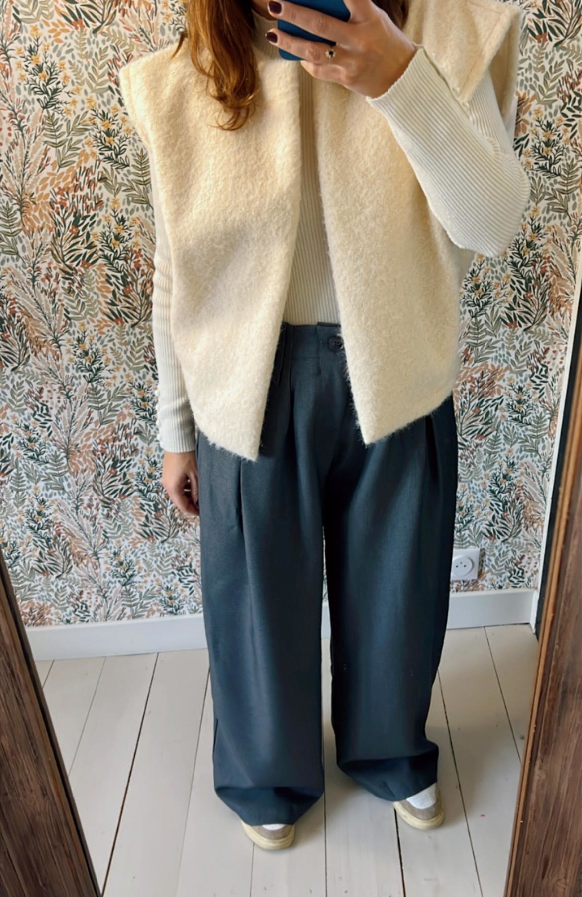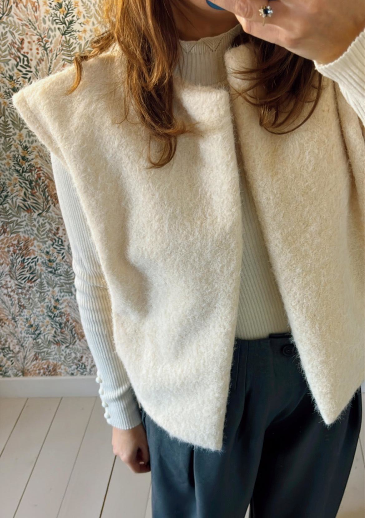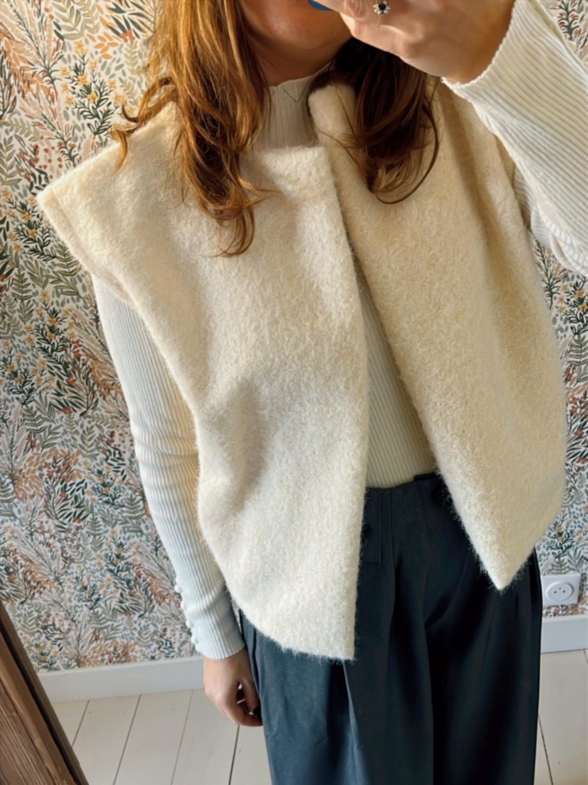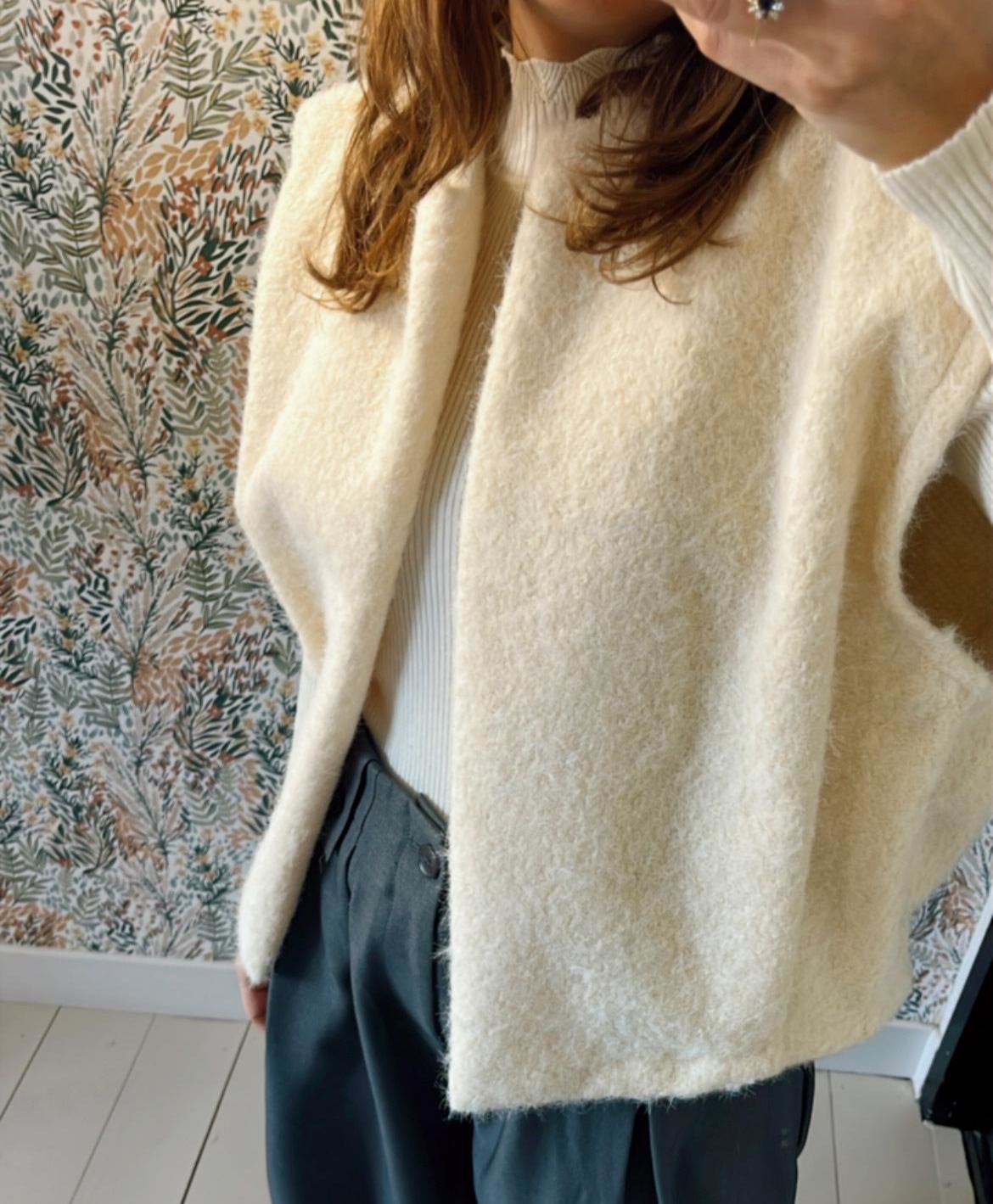 Avec sa coupe épurée et sa texture duveteuse, le gilet Alma est une caresse de chaleur sur les épaules. Confectionné dans un tissu effet laine bouclée, il se porte aussi bien sur une chemise structurée que sur un pull fin, pour un style doux et sophistiqué.
