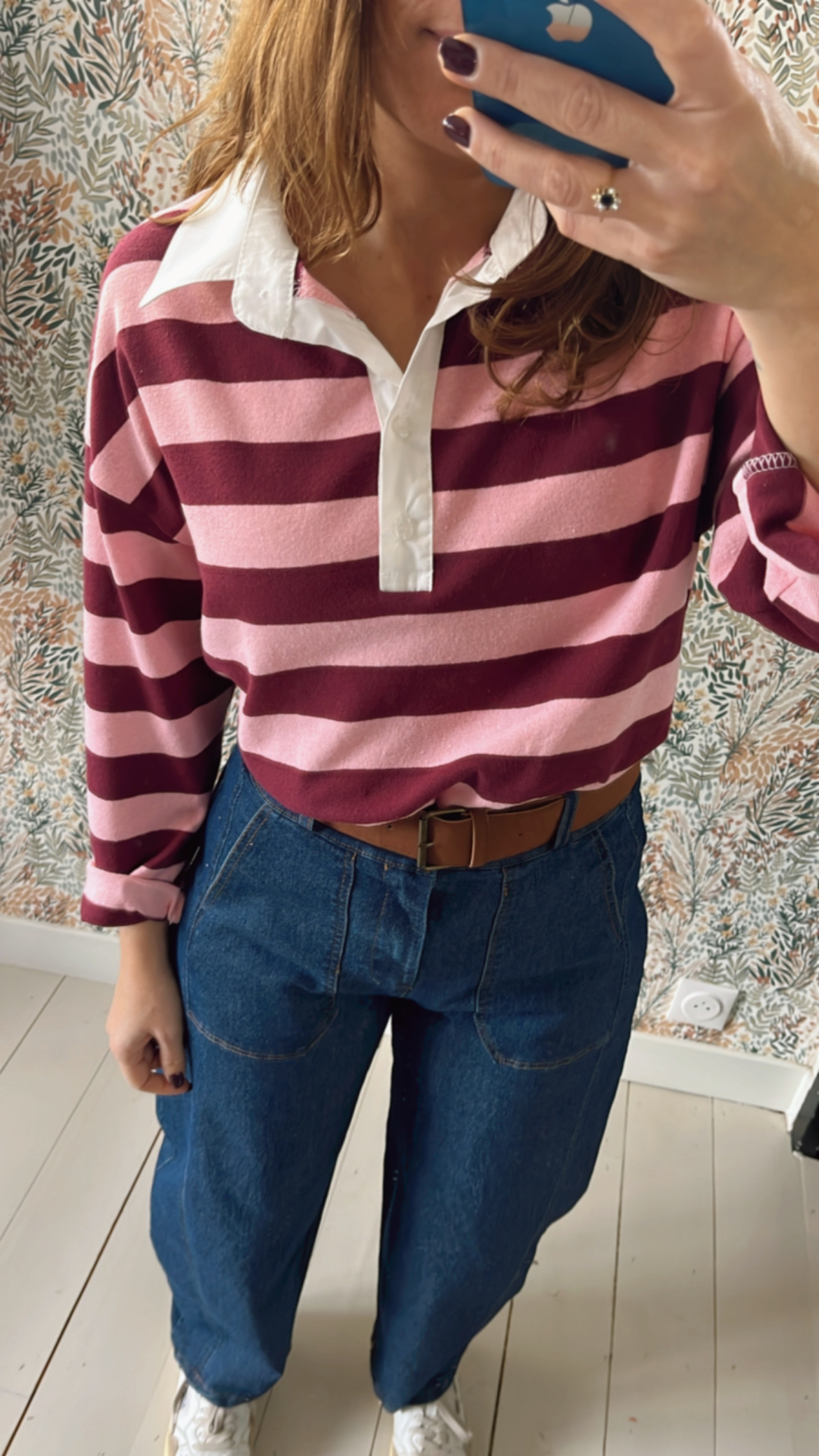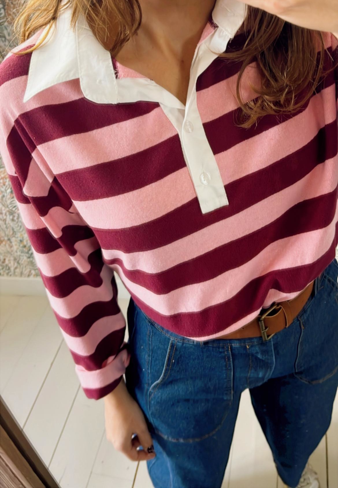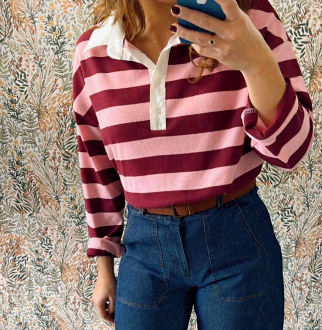 Avec ses larges rayures framboise et rose tendre, le polo Bianca évoque les après-midis en bord de mer et les looks preppy revisités. Son col blanc contrastant et sa patte boutonnée lui donnent une allure à la fois rétro et moderne, facile à porter au quotidien.