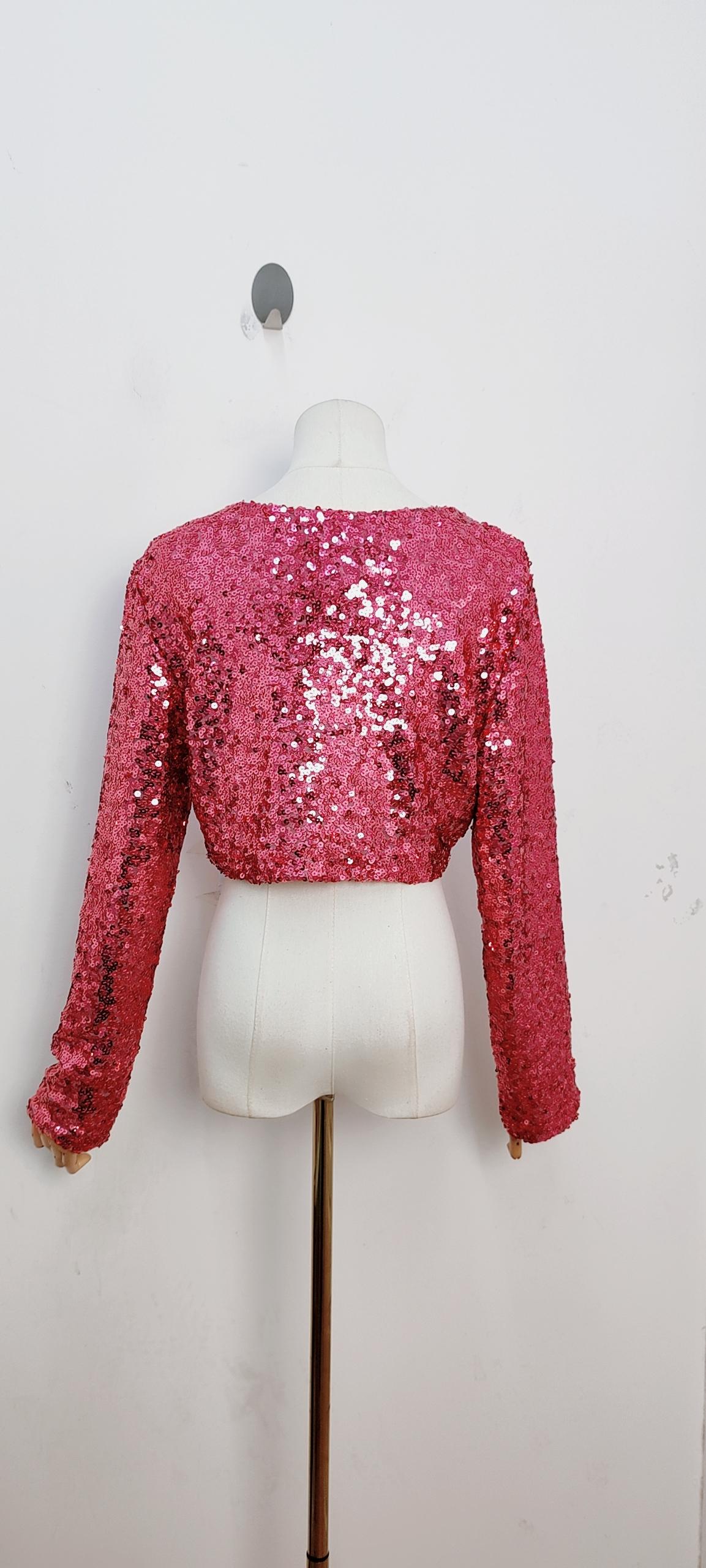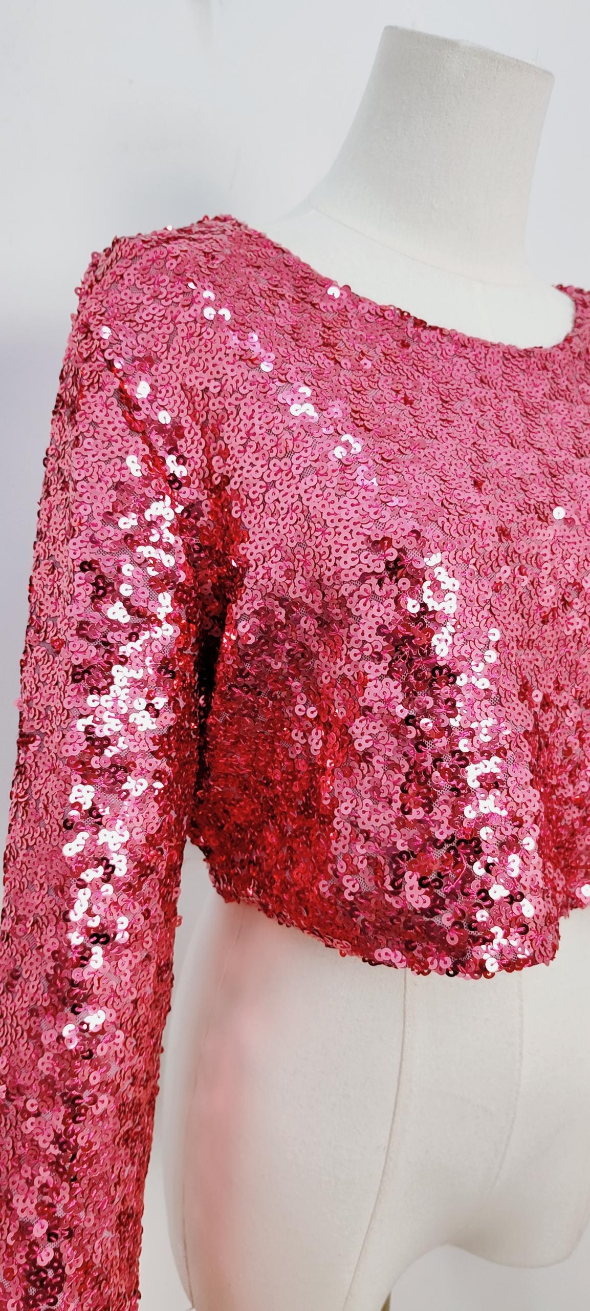 Entièrement brodé de sequins fuchsia, il illumine la silhouette d’un éclat vibrant et audacieux.